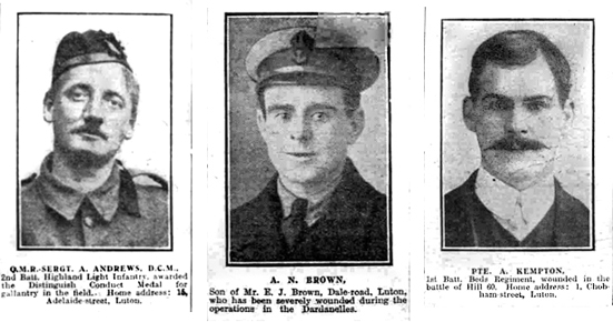 Pte Albert Kempton (pictured below, right) , 7886, 1st Battalion Bedfordshire Regiment,has been undergoing medical treatment at Bedford and hoping to visit his wife and family at their home at 1 Chobham Street, Luton. He said: "I met with my 'accident' at the fateful Hill 60...I was buried alive in a big house, and it took some time to get me out. I was knocked out by a 'Jack Johnson' shell which burst and blew the whole place up. I was underneath with about eight or ten tons of it over me. How I got out, God only knows."