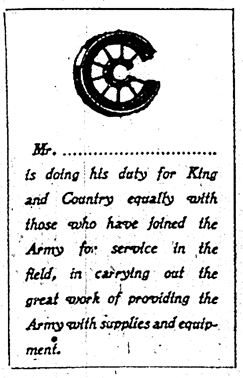 Following the letter from Secretary of State for War, Lord Kitchener, thanking Commercial Cars employees for their efforts with supplies and equipment for the war effort, the staff have each been given specially printed cards to recognise their achievements.