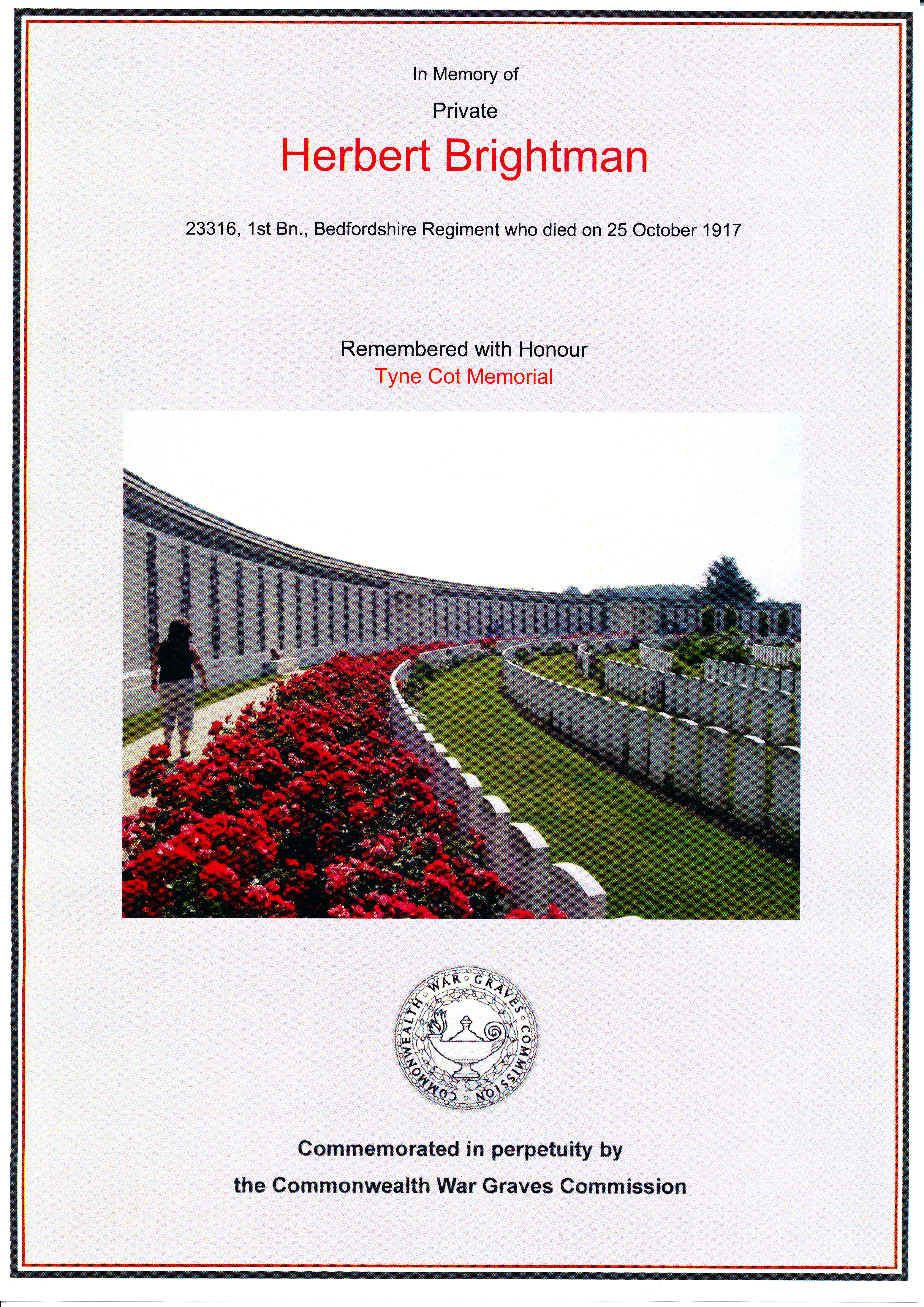 Herbert Brightman was one of five sons of Samuel and Sarah Brightman who served on the Western Front. Tragically four of the five sons were killed. Alfred was killed in action on 25th October 1917, aged 34. He was the third Brightman son to be killed.