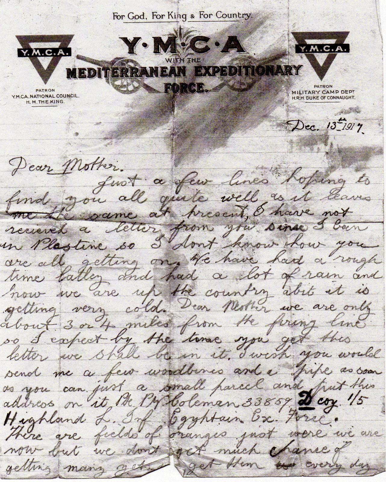 Just a few lines hoping to find you quite well as it leaves me the same at present. I received those 3 parcels what you sent me in Palestine, but my address is Pte. PW Coleman 33859: 14 Platoon D coy, 1/5 Highland L Inf. B.E.F. France. Note Address.